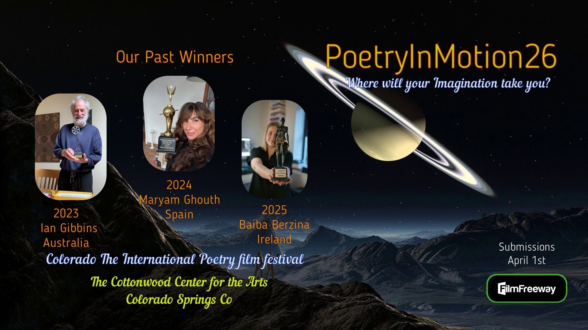 “Poetry in Motion" Colorados Premier International Poetry film festival. The festival will select up to 18 shortlisted films. The best poetry film will be chosen on October 14th 2026.